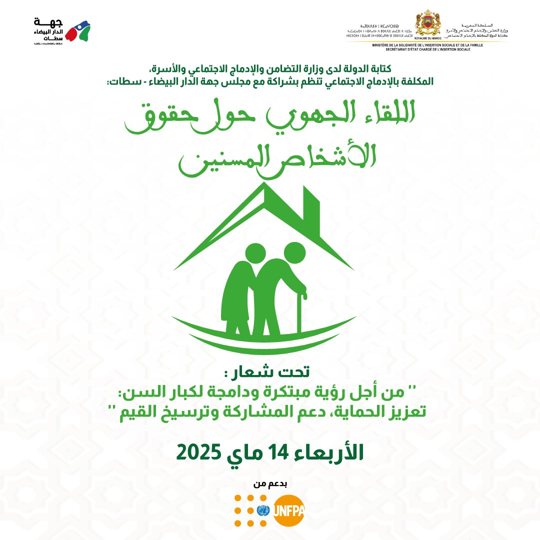 يترأس السيد عبد الجبار الرشيدي، كاتب الدولة لدى وزيرة التضامن والإدماج الاجتماعي والأسرة المكلف بالإدماج الاجتماعي لقاء جهويا حول حقوق الأشخاص المسنين، بشراكة مع مجلس جهة الدار البيضاء سطات، وذلك يوم الأربعاء 14 ماي بالدار البيضاء، بمقر مجلس جهة الدار البيضاء سطات.